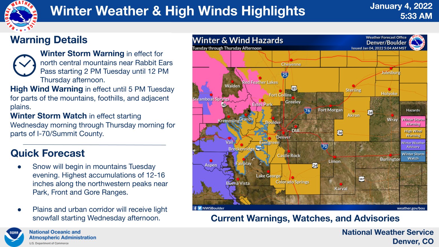 The mountains can expect snow on Tuesday with. HiLow RealFeel precip radar everything you need to be ready for the day commute and weekend. Weather and snow forecast Winter weather advisories are in effect for Summit County the Mosquito Range and Indian Peaks until 5 pm.